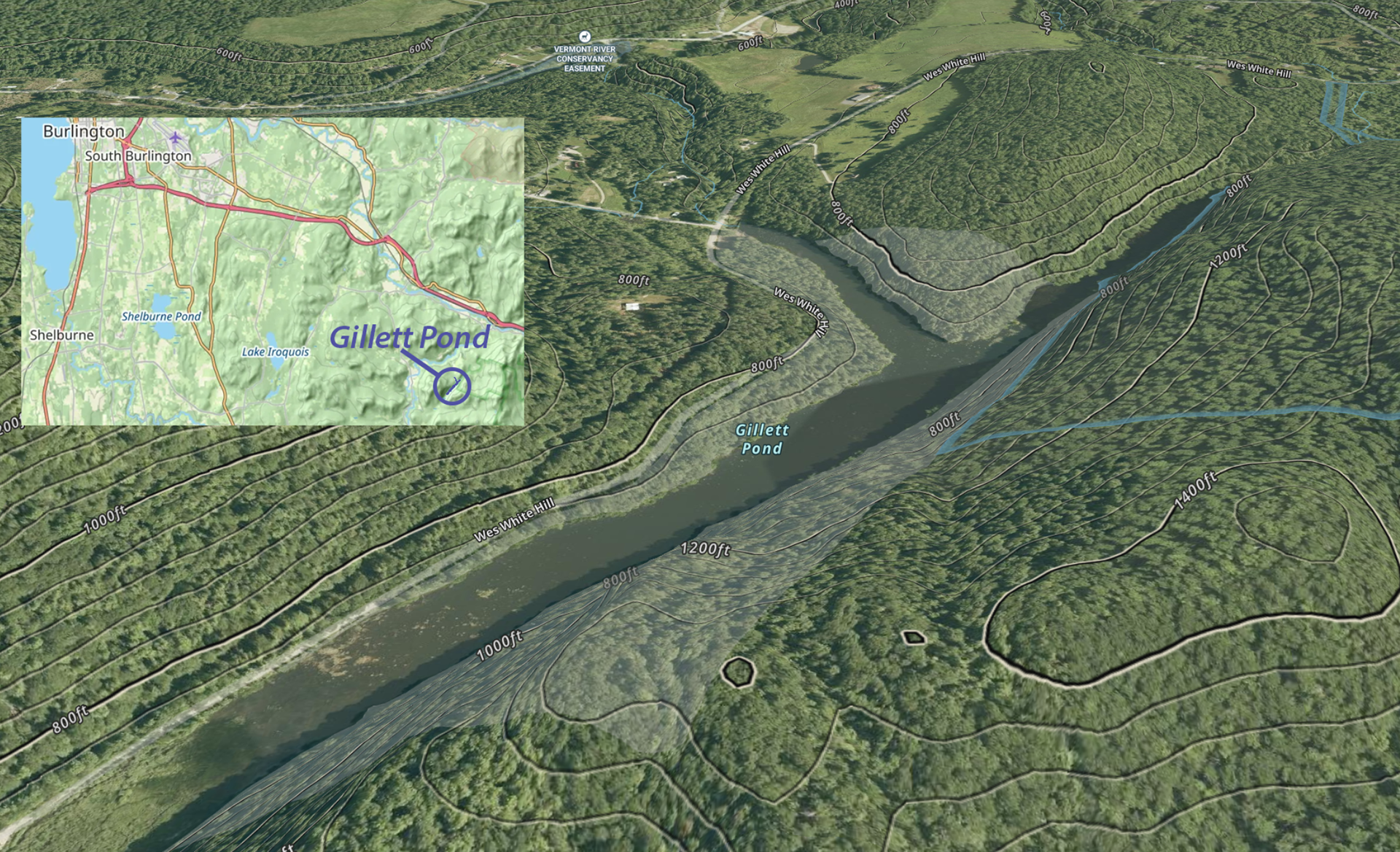 Through the efforts of the Friends of Gillett Pond, the land shown highlighted is now owned by the Richmond Land Trust. The Robbins Mountain Wildlife Management Area just to the east of the pond is shown outlined in blue and adds to the conservation of the area. Straddling the Richmond and Huntingdon town border, 30-acre Gillett Pond is located at about 650 ft elevation. The higher elevation meant the lake could be and was used as an energy storage mechanism for the short-lived hydroelectric facility which once was located near Huntington Gorge. That area is shown as a Vermont River Conservancy easement in the Huntington river valley and also owned by the Richmond Land Trust.